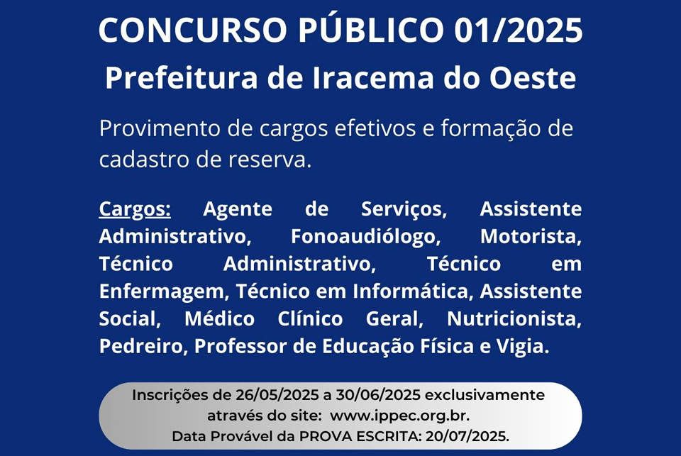 A aplicação da Prova Escrita está prevista para o dia 20 de julho de 2025. O Edital na íntegra pode ser acessado no Site Oficial do Município, http://iracemadooeste.pr.gov.br/, no ícone Concursos Públicos ou através do site www.ippec.org.br.