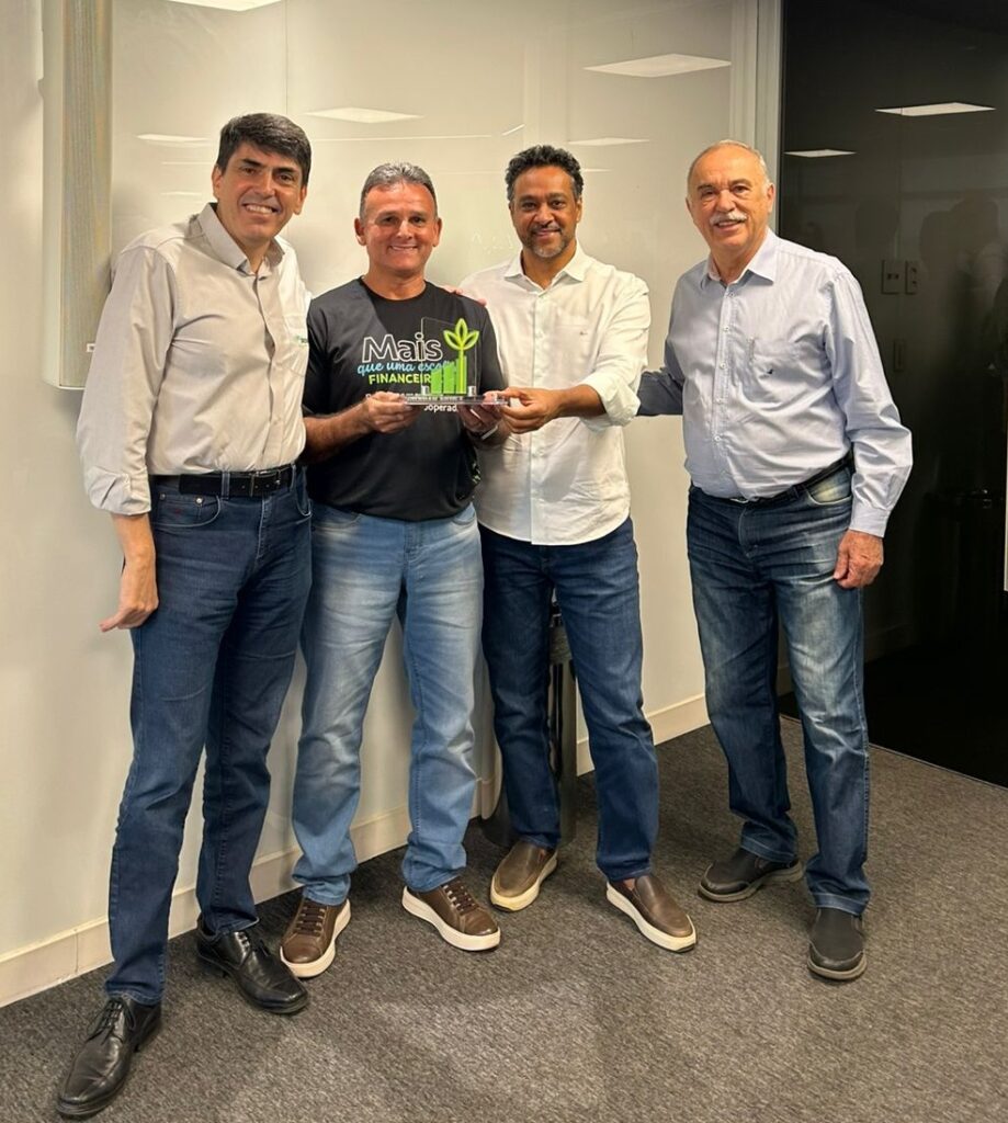Ele recebeu o troféu das mãos de Marco Aurélio de Almada Abreu, presidente do Centro Cooperativo Sicoob, e de Miguel Oliveira, presidente do Conselho de Administração do CCS.