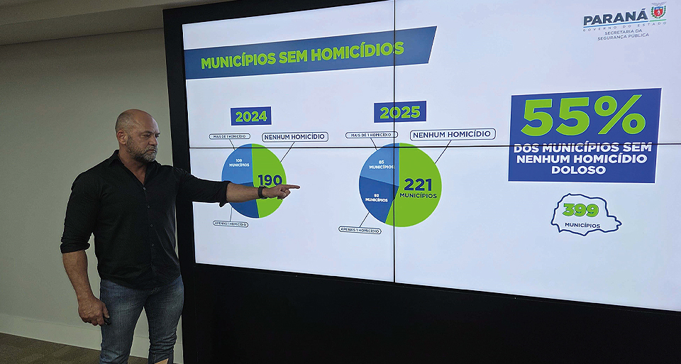 55% DAS CIDADES SEM HOMICÍDIOS – A melhora nos índices de violência letal também se reflete no aumento do número de municípios paranaenses sem homicídios dolosos. No primeiro semestre de 2024, eram 192 cidades sem registro desse tipo de crime. Em 2025, o número subiu para 221, o que representa 55% dos municípios do Paraná. Em outras 93 cidades (23%) só houve um caso registrado.
