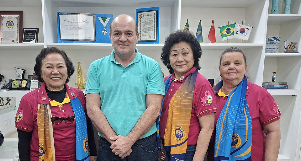 Na tarde de quarta-feira (30), o prefeito em exercício de Assis Chateaubriand, Osmar Rinki, recebeu em seu gabinete a visita de representantes da Associação Casa da Amizade (ACA). Estiveram presentes Nayru Yamanaka, presidente recém-empossada para o período de gestão 2025-2027, Ângela Maria (Tica), primeira tesoureira da instituição, e Maria Teresa Iwakura, representante junto à Coordenadoria Distrital.