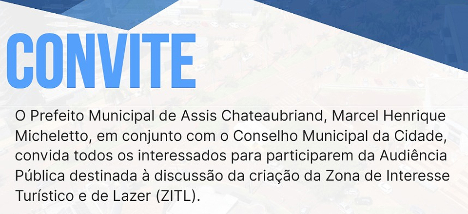 No próximo dia 7 de agosto, às 18h30, será realizada uma Audiência Pública no Centro de Convenções do Paço Municipal de Assis Chateaubriand. O evento tem como objetivo discutir a proposta de criação da Zona de Interesse Turístico e de Lazer no município, uma iniciativa que promete impulsionar o desenvolvimento local e atrair investimentos para a região. A Audiência Pública é uma oportunidade para que a comunidade, autoridades e especialistas possam debater os impactos e benefícios dessa nova zona, que visa fortalecer o turismo e ampliar as opções de lazer para moradores e visitantes.