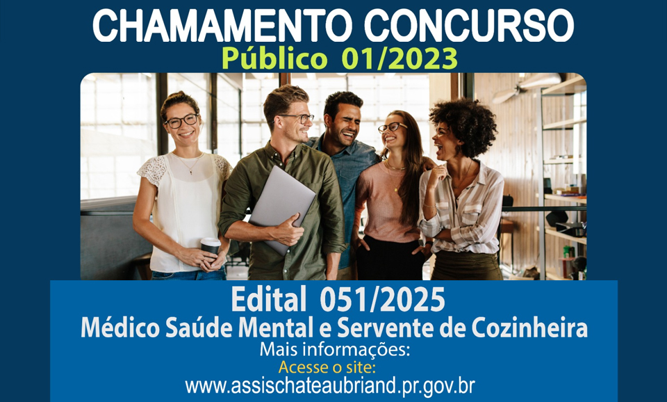 Publicado nesta segunda-feira (11), em diário oficial do município de Assis Chateaubriand, o edital 051/2025, tratando-se da quinquagésima oitava convocação de candidato habilitado no concurso público 01/2023, visando à nomeação no cargo de Médico Saúde Mental e Servente de Cozinheira.