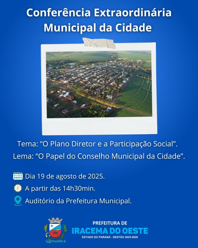 A Prefeita Elza Haase Rodrigues convocou para o dia 19 de agosto, a partir das 14h30min a Conferência Extraordinária Municipal da Cidade de Iracema do Oeste, com o tema “O Plano Diretor e a Participação Social” e o lema “O Papel do Conselho Municipal da Cidade”. A conferência irá acontecer no Auditório da Prefeitura Municipal.