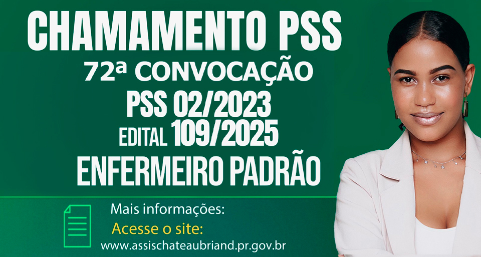 O município de Assis Chateaubriand publicou nesta segunda-feira (25) a convocação de candidatos aprovados em Processos Seletivos Simplificados (PSS) para o cargo de Enfermeiro Padrão. O edital PSS nº 109/2025 publicado no diário oficial, refere-se à 72ª convocação do PSS 02/2023.