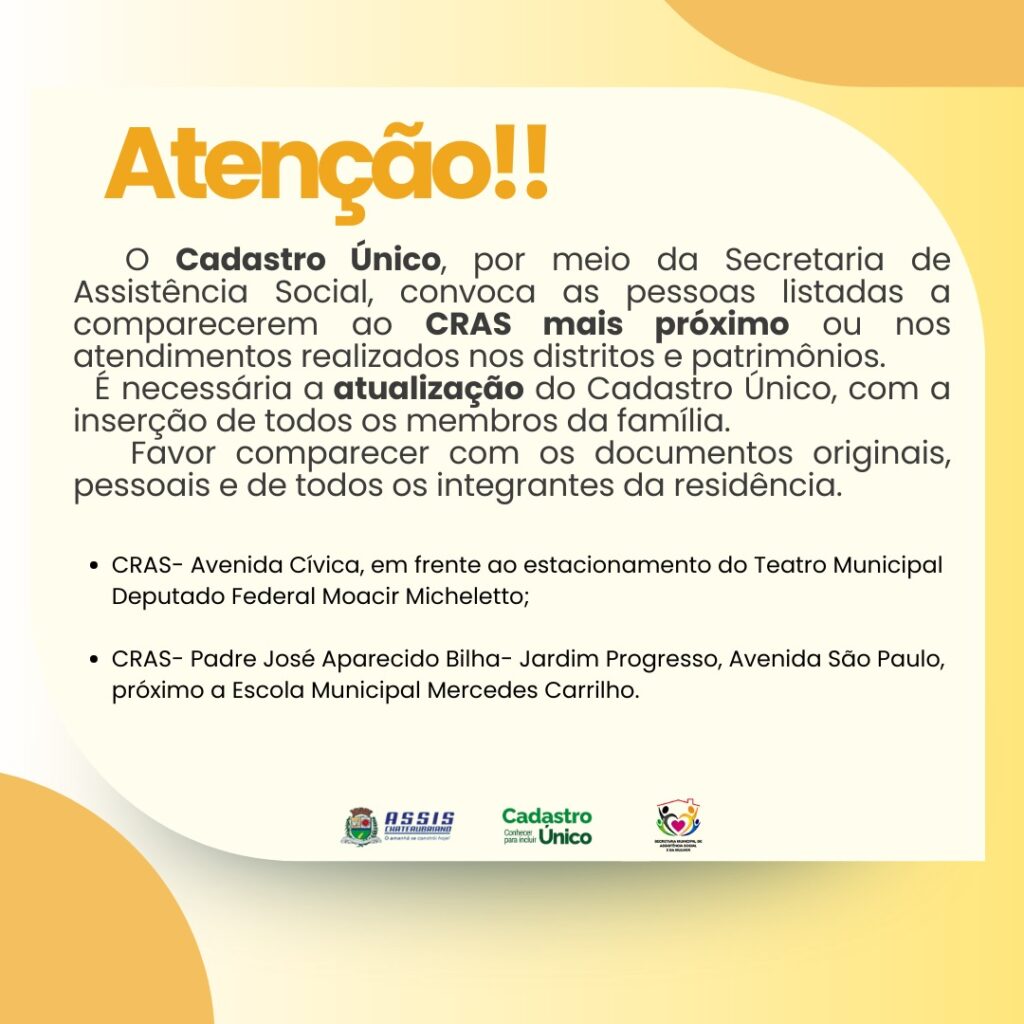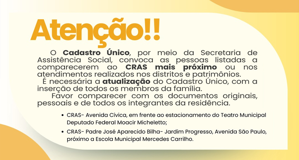 A Secretária Municipal de Assistência Social Susana Borella informa que “Apesar dos chamamentos anteriores que realizamos tem algumas pessoas que ainda não compareceram para realizar a atualização no Cadastro Único, desta forma pedimos que o façam com maior brevidade, para que não percam seus benefícios”, afirmou Susana.