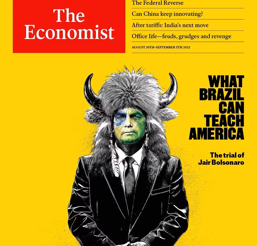 Com a manchete intitulada “O que o Brasil pode ensinar para a América”, a reportagem da revista britânica The Economist ressalta que, prestes a ser julgado por tentativa de golpe de Estado, Bolsonaro encarna a figura do “Trump dos trópicos”.
