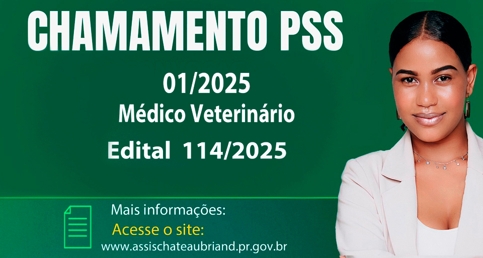 O município de Assis Chateaubriand publicou nesta terça-feira (3) a convocação de candidatos aprovados em Processos Seletivos Simplificados (PSS) para o cargo de Médico Veterinário. O edital PSS nº 114/2025 publicado no diário oficial, refere-se à 7ª convocação do PSS 01/2025.