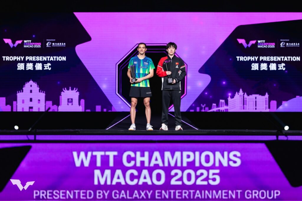 Hugo Calderano com o troféu de vice-campeão do WTT Champions de Macau, ao lado do chinês Wang Chuqin, campeão do torneio. Foto: WTT / Divulgação