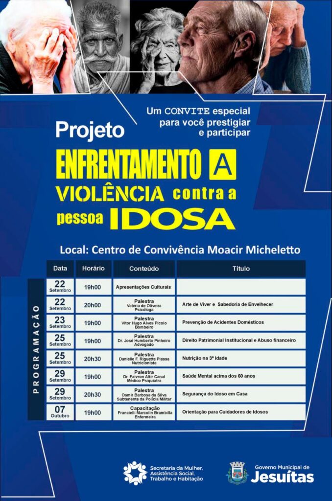 A Prefeitura de Jesuítas, por meio da Secretaria de Assistência Social, promove entre os meses de setembro e outubro uma série de encontros dedicados ao enfrentamento à violência contra a pessoa idosa. As atividades serão realizadas no Centro de Convivência Moacir Micheletto e contam com apresentações culturais, palestras temáticas e uma capacitação voltada a cuidadores.