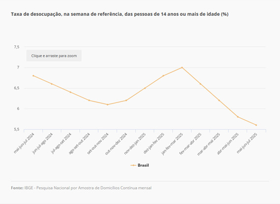 A taxa de desemprego do trimestre móvel encerrado em julho de 2025 caiu para 5,6% — a menor da série histórica do indicador, iniciada em 2012. No trimestre, a população desocupada caiu para 6,118 milhões, o menor contingente desde o último trimestre de 2013 (6,1 milhões). Estes são alguns dos destaques da Pesquisa Nacional por Amostra de Domicílios (Pnad) Contínua, divulgada nesta terça-feira, 16 de setembro, pelo Instituto Brasileiro de Geografia e Estatística (IBGE).