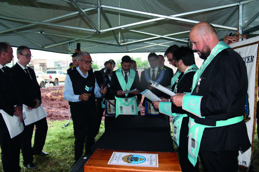 Sob a presidência do venerável André Mitsuo Karia e seguindo todos os tradicionais ritos maçônicos, a cerimônia do lançamento da pedra fundamental contou com a presença de ilustres convidados, com destaque para o Grão Mestre estadual da Grande Oriente Brasil – Paraná, Paulo Roberto Soches, o coordenador regional, Dpomgps Voda-Costa Filho, e Cristhian Guilherme Goldoni, que no ato representou a Loja Maçônica Estrela de Oeste.