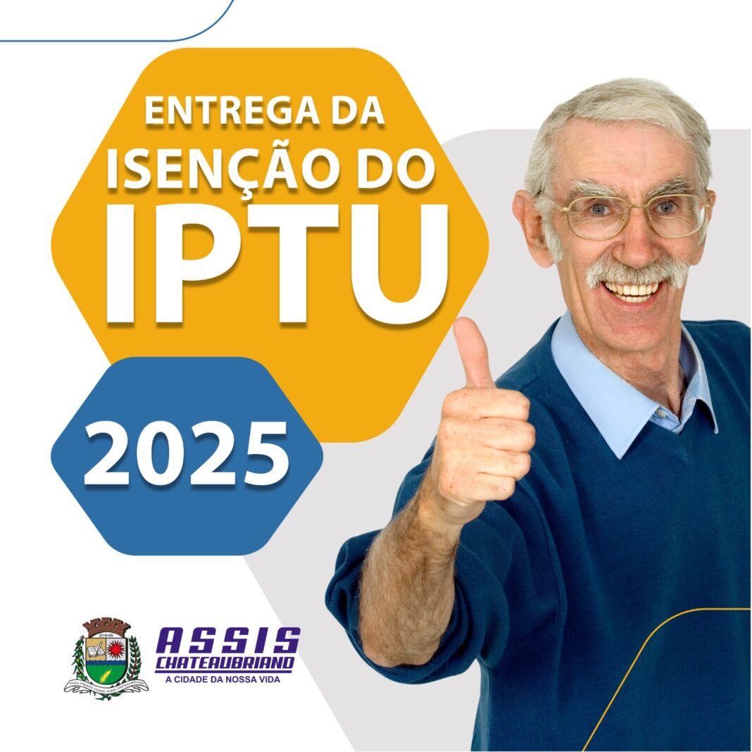 A Prefeitura de Assis Chateaubriand, por meio da Secretaria de Habitação e Assuntos Comunitários, informa aos munícipes que a entrega das isenções do IPTU 2025, inicialmente programada para o dia 30 de outubro, foi remarcada para o dia 19 de novembro, às 9h, no Centro de Convivência do Idoso (CCI).