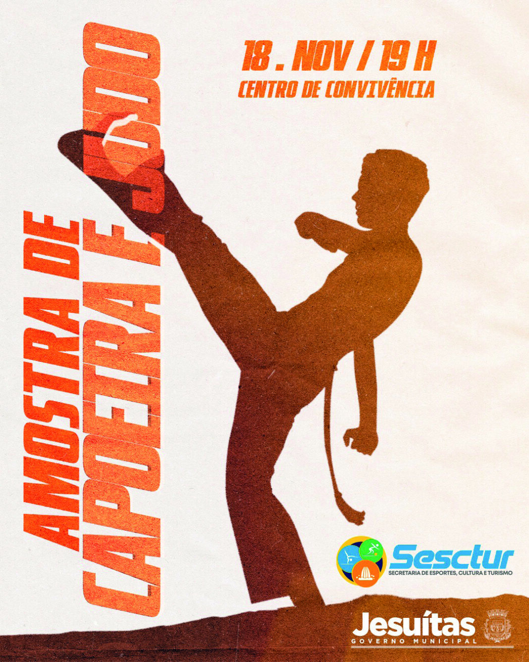 A Prefeitura de Jesuítas, por meio da Secretaria Municipal de Esportes, realiza no próximo dia 18 de novembro, às 19h, no Centro de Convivência Moacir Micheletto, a Amostra das Oficinas de Capoeira e Judô.