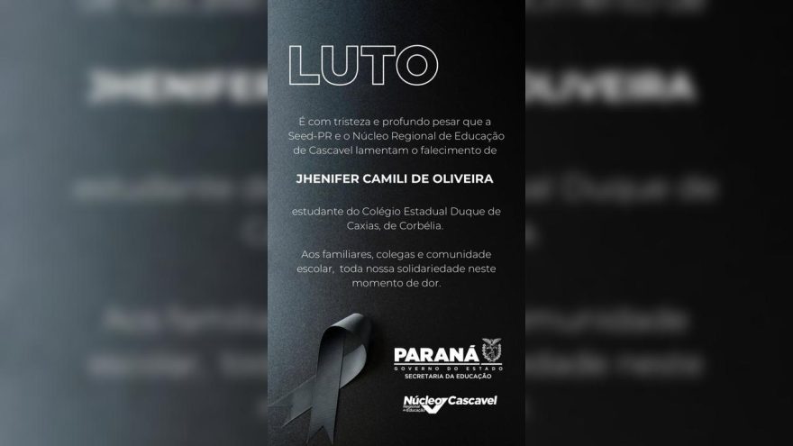 O Núcleo Regional de Educação de Cascavel, em conjunto com a Secretaria de Estado da Educação do Paraná (Seed-PR), divulgou uma nota de pesar lamentando o falecimento da estudante Jhenifer Camili de Oliveira. A jovem era aluna do Colégio Estadual Duque de Caxias, localizado no município de Corbélia.