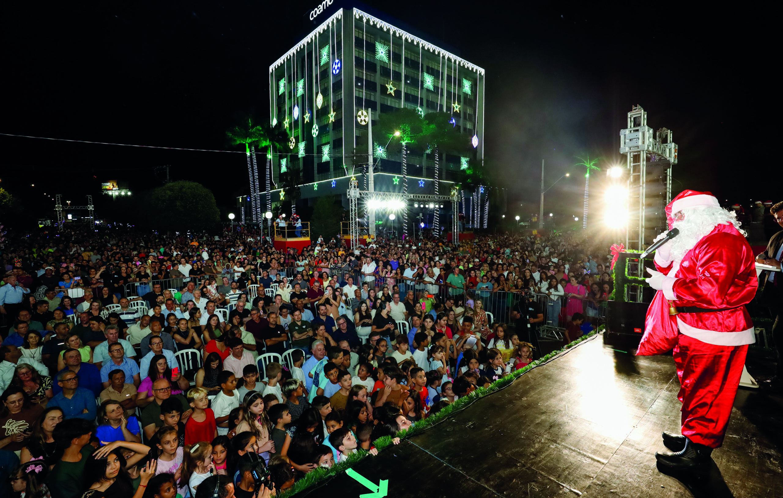 A Coamo realizou na noite de quarta-feira, 26, mais uma edição do Natal de Luzes em Campo Mourão, no Centro-Oeste do Paraná. O evento reuniu mais de oito mil pessoas da cidade de toda a região. O tema escolhido para 2025 foi “Há sempre algo a compartilhar! É assim que a gente cresce!”.