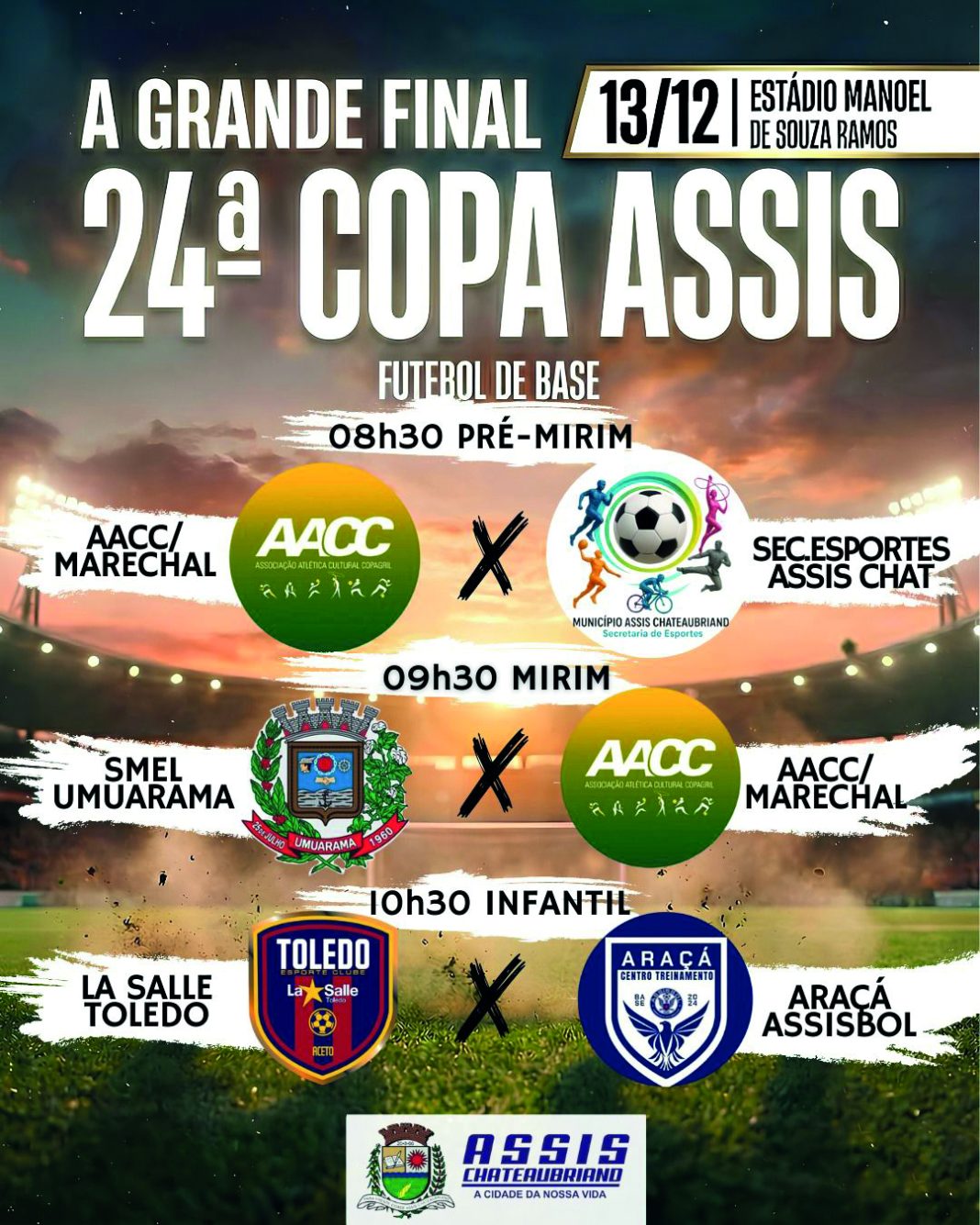 No sábado, dia 13 de dezembro, no Estádio Municipal Manoel de Souza Ramos, em Assis Chateaubriand, acontece a grande final da 24ª Copa Assis de Futebol Categoria de Base 2025. O evento reunirá equipes de destaque nas categorias Pré-Mirim, Mirim e Infantil.
