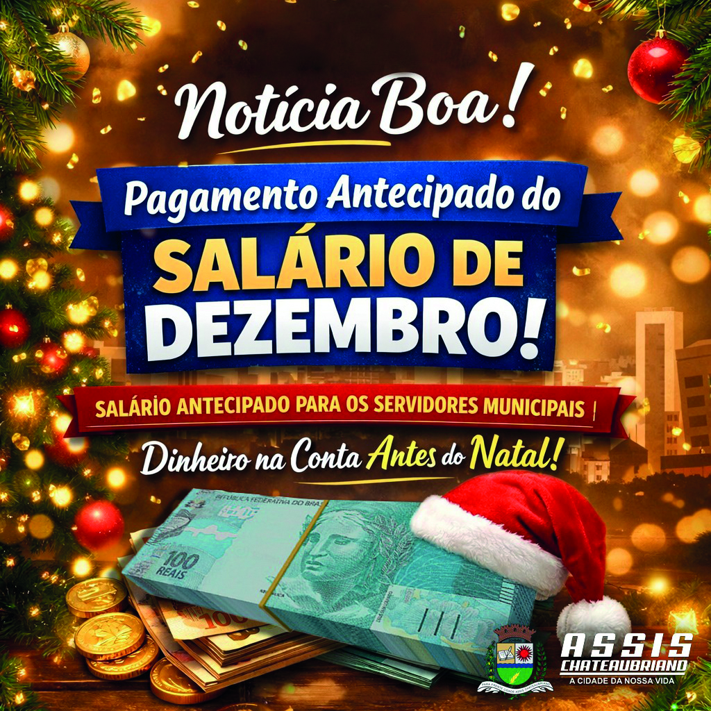 A Prefeitura de Assis Chateaubriand anunciou a antecipação do pagamento da folha salarial referente ao mês de dezembro de 2025 para os servidores municipais. Originalmente previsto para o dia 29, o pagamento será efetuado na sexta-feira, 19 de dezembro. A decisão foi tomada pelo prefeito Marcel Micheletto com o objetivo de proporcionar maior tranquilidade financeira aos funcionários públicos durante o período de festas de final de ano.