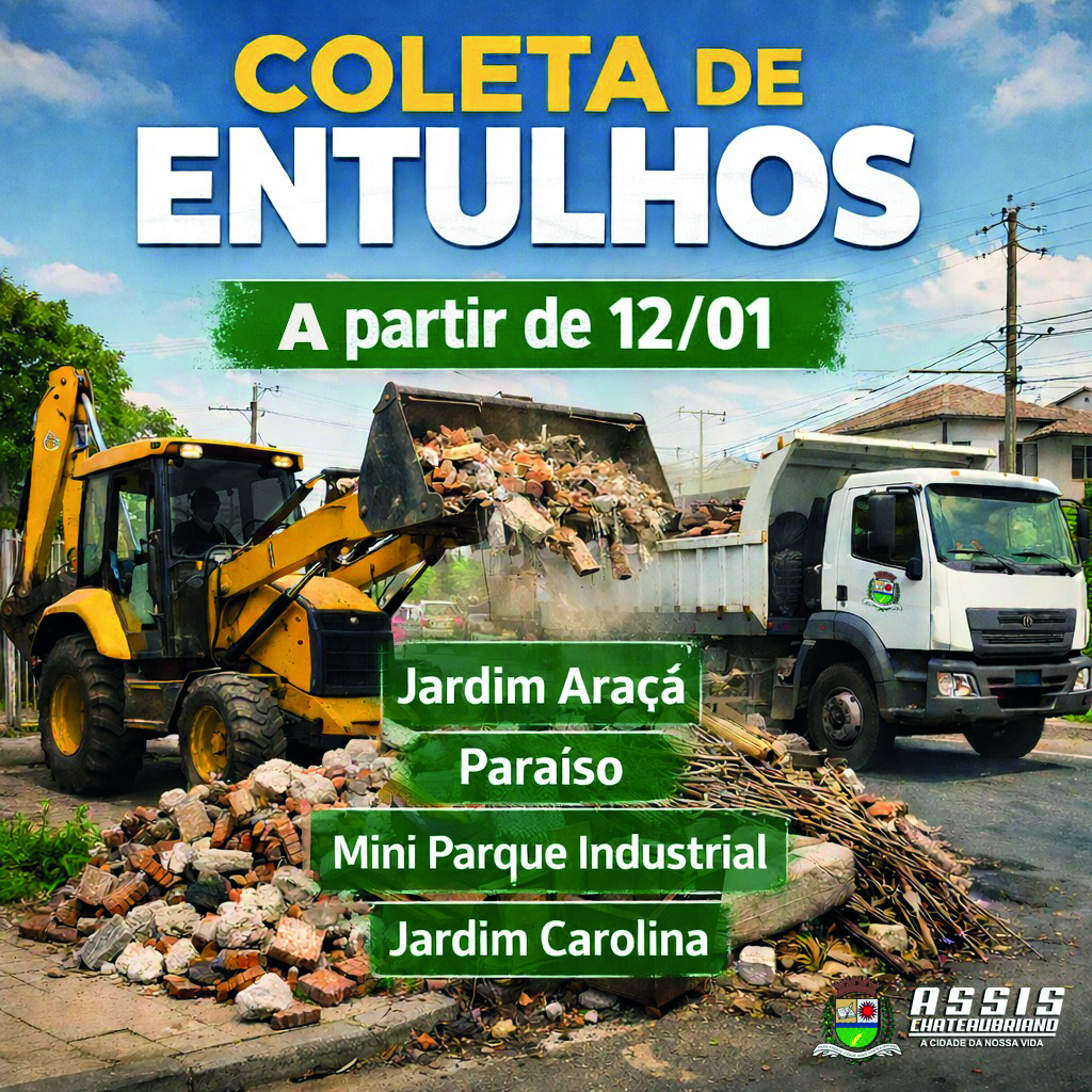 A Prefeitura Municipal de Assis Chateaubriand, por meio da Secretaria de Serviços Urbanos e Meio Ambiente, informa que realizará, na próxima segunda-feira, 12 de janeiro, limpeza com coleta de resíduos volumosos, restos de construção civil, resíduos verdes e outros materiais nos bairros Jardim Araçá, Paraíso, Mini Parque Industrial e Jardim Carolina.