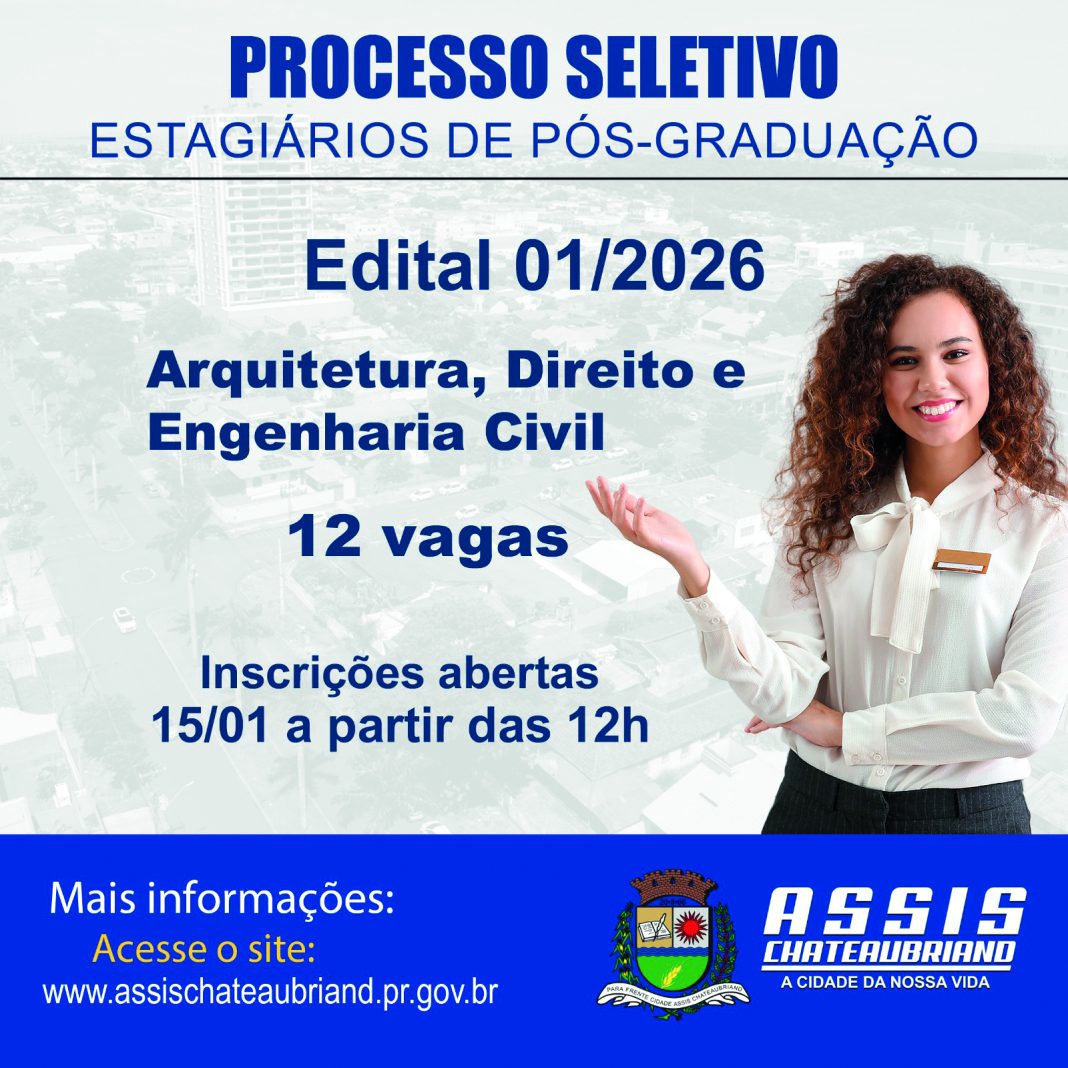 A Prefeitura de Assis Chateaubriand anunciou, por meio do edital 01/2026 publicado no Diário Oficial nesta quarta-feira (14), a abertura de um novo Processo Seletivo para contratação de estagiários. As inscrições estarão disponíveis a partir das 12h desta quinta-feira (15) e seguem até o dia 26 de janeiro de 2026, às 12h, exclusivamente pelo site www.maisestagios.com.br.