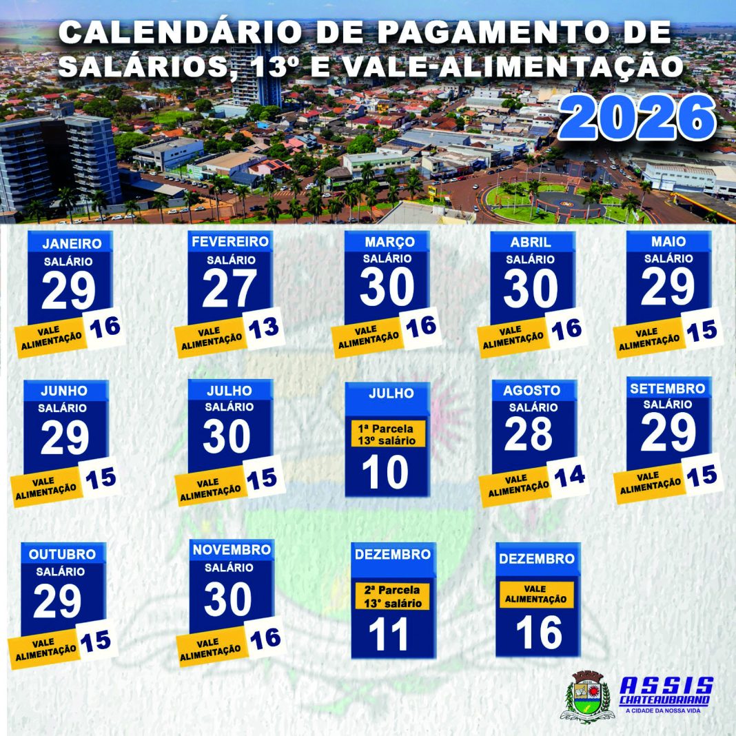 A Prefeitura de Assis Chateaubriand, assim como fez no ano passado, divulgou de forma antecipada o cronograma de pagamentos para o ano de 2026. Abrange datas relacionadas ao pagamento de salários, parcelas do 13º salário e do auxílio alimentação aos servidores públicos.
