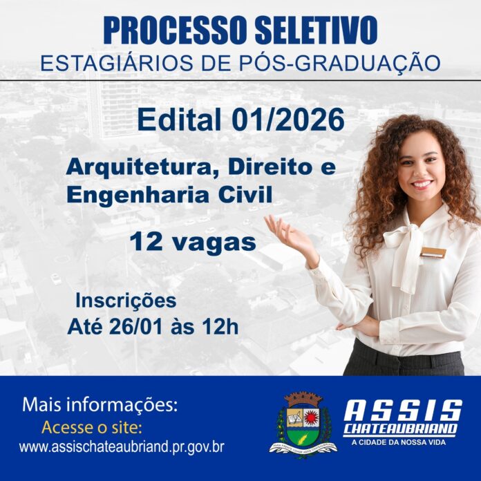 Estão abertas, até segunda-feira (26) às 12h, as inscrições para um novo Processo Seletivo Especial (PSE) voltado à contratação de estagiários de pós-graduação em Assis Chateaubriand. As inscrições devem ser realizadas exclusivamente pelo site:http://[www.maisestagios.com.br] (http://www.maisestagios.com.br).