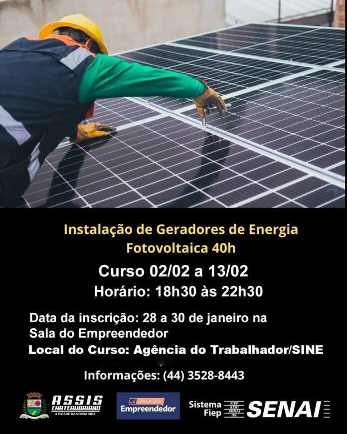A Prefeitura de Assis Chateaubriand, por meio da Secretaria de Desenvolvimento Econômico, Trabalho e Turismo, informa que estarão abertas as inscrições para o curso de Instalação de Geradores de Energia Solar de 28 a 30 de janeiro. A capacitação, adquirida junto ao SENAI (Serviço Nacional de Aprendizagem Industrial), e oferecida gratuitamente, será realizada na Agência do Trabalhador (SINE) entre os dias 2 e 13 de fevereiro, totalizando uma carga horária de 40 horas.