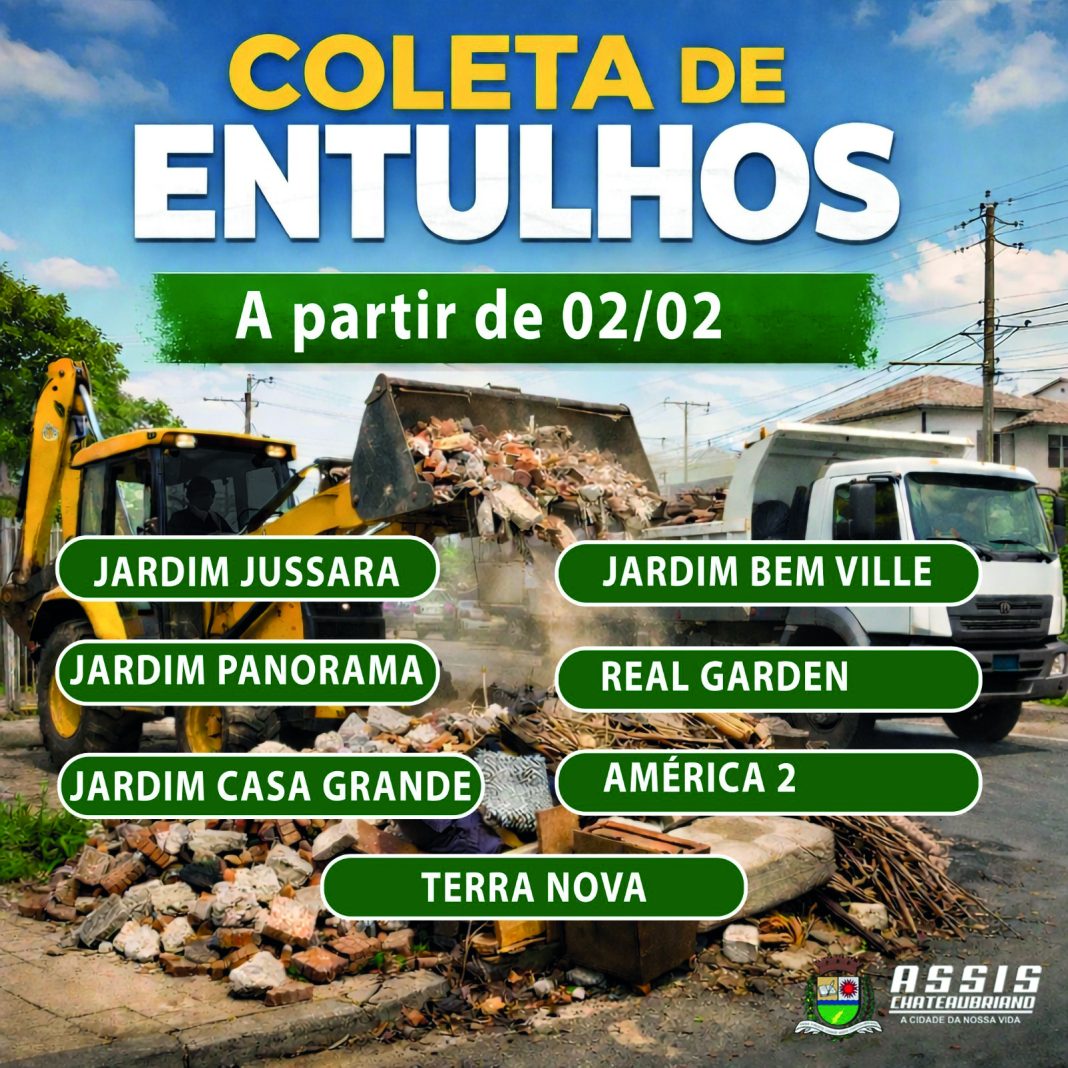 A partir do dia 2 de fevereiro, os moradores dos bairros Jardim Jussara, Jardim Panorama, Jardim Casa Grande, Jardim Bem Ville, Real Garden, América 2 (entre a Avenida Radial Leste e Rua Cordilheira dos Andes) e Patrimônio de Terra Nova poderão colocar em frente às suas residências resíduos volumosos, restos de construção civil e outros materiais para coleta. A Prefeitura Municipal de Assis Chateaubriand, por meio da Secretaria de Serviços Urbanos e Meio Ambiente, segue com uma importante ação de limpeza urbana.