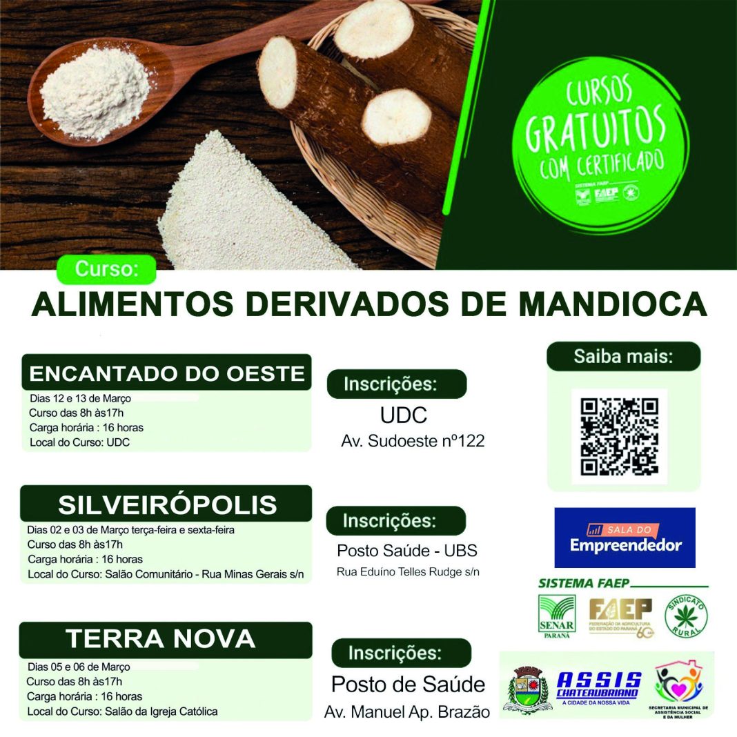 O Município de Assis Chateaubriand informa que estão abertas as inscrições para Cursos de Derivados de Mandioca, que serão realizados no Patrimônio do Silveiropólis, nos dias 2 e 3 de março, e deverão ser feitas no Posto de Saúde da localidade. O treinamento ocorrerá no Salão Comunitário do Silveiropólis, das 8h às 17h