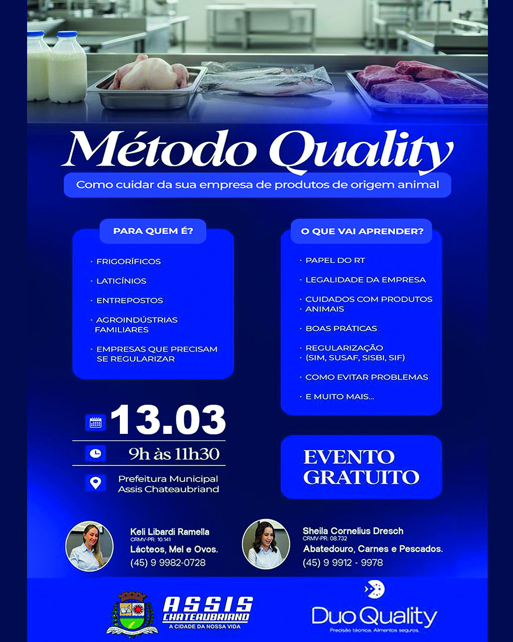 O município de Assis Chateaubriand, por meio da Secretaria de Agricultura e Transporte, realizará no próximo dia 13 de março, das 9h30 às 11h30, o evento “Método Quality”. A iniciativa acontecerá no Teatro Municipal Deputado Federal Moacir Micheletto e tem como objetivo principal orientar empresas e produtores sobre cuidados e procedimentos necessários para a regularização de negócios que trabalham com produtos de origem animal. O evento é gratuito e aberto ao público interessado.