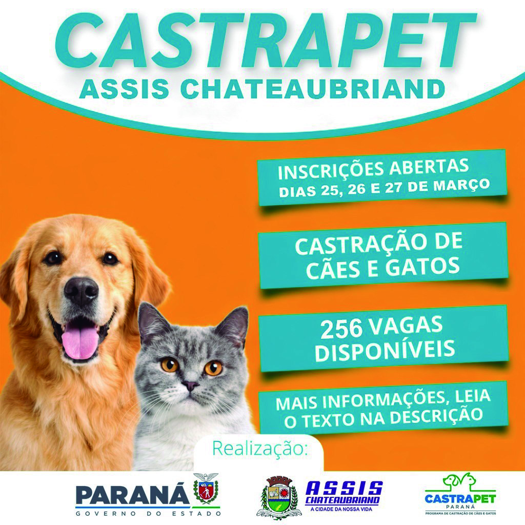 Começam nesta quarta-feira (25), as inscrições para as 256 castrações gratuitas para cães e gatos que será realizada no município de Assis Chateaubriand no mês de abril. As castrações são por meio do Programa CastraPet Paraná, iniciativa do Governo do Estado do Paraná