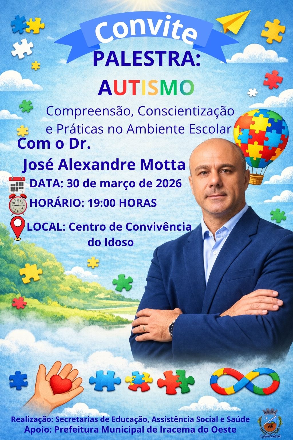 A Administração Municipal de Iracema do Oeste, por meio das Secretarias de Educação, Assistência Social e Saúde, promove no próximo dia 30 de março, às 19h, no Centro de Convivência do Idoso, uma palestra voltada à conscientização sobre o autismo.