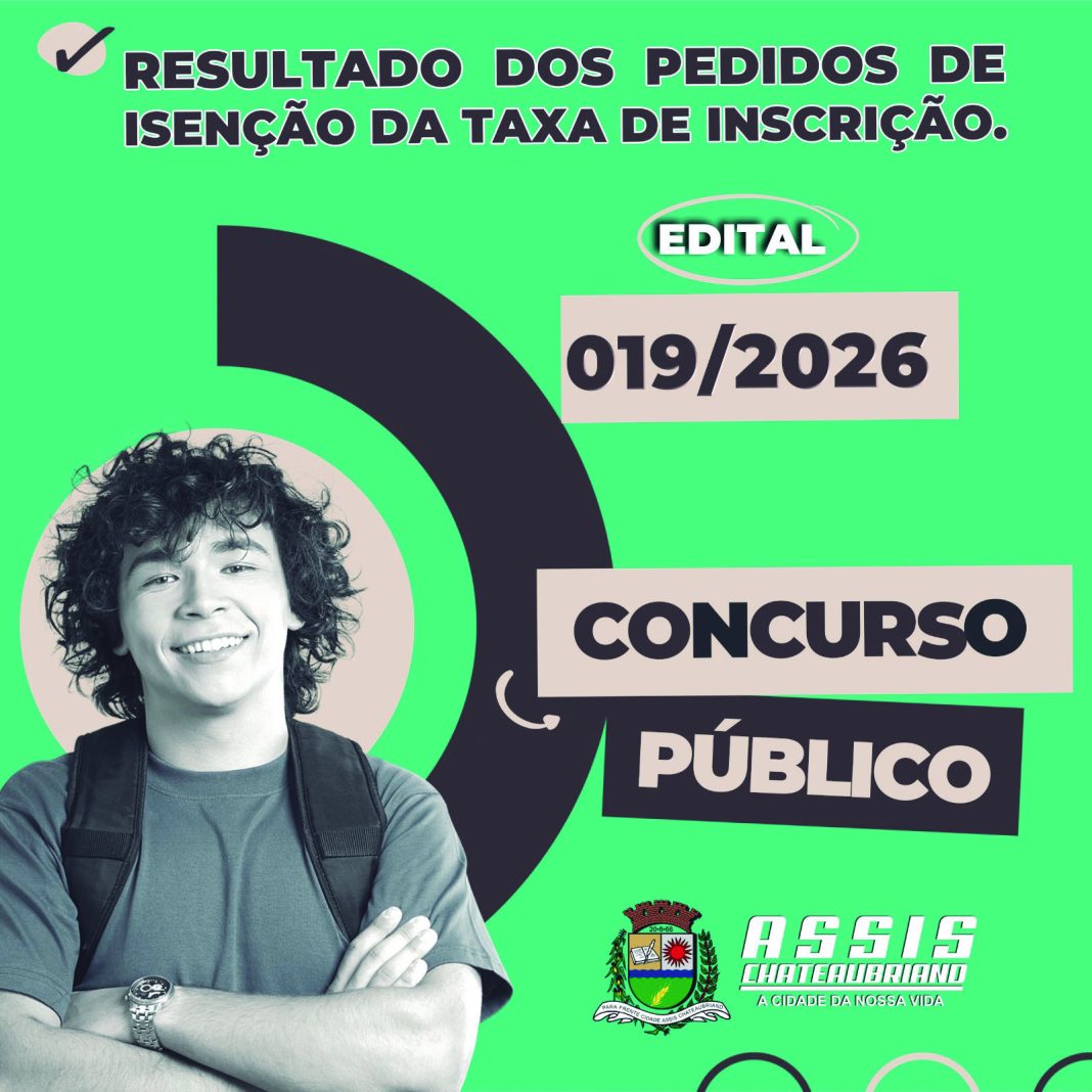 Foi publicado nesta quinta-feira (26), no Diário Oficial do Município de Assis Chateaubriand, o edital nº 019/2026, referente ao Concurso Público nº 01/2026. O documento apresenta informações importantes sobre o resultado dos pedidos de isenção da taxa de inscrição.