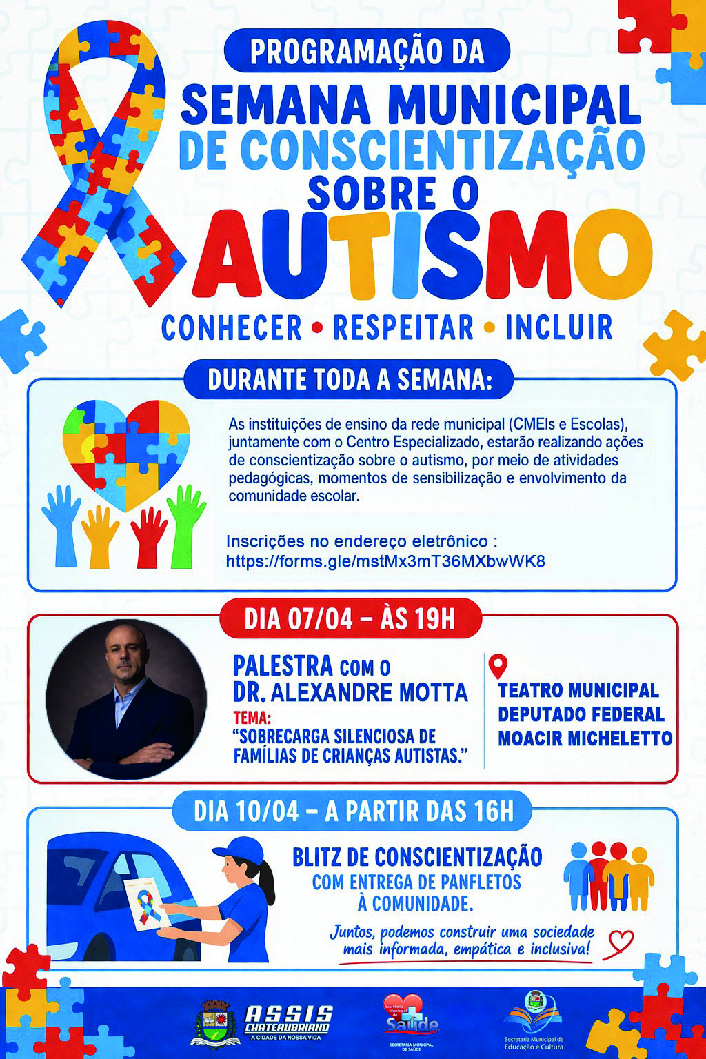 Um dos destaques da programação será a palestra do médico pediatra Dr. José Alexandre Motta, com o tema “Sobrecarga silenciosa de famílias de crianças autistas”. O encontro acontece no dia 7 de abril, às 19h, no Teatro Municipal Deputado Moacir Micheletto, e é aberto ao público. Durante o evento, também haverá apresentações dos alunos do Centro Especializado, reforçando a importância da inclusão. As pessoas interessadas devem fazer a inscrição no endereço eletrônico: https://forms.gle/mstMx3mT36MXbwWK8.