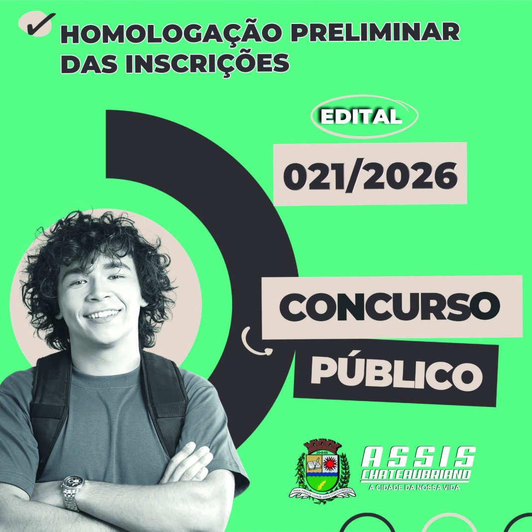 A Prefeitura Municipal de Assis Chateaubriand publicou nesta quarta-feira, 8 de abril de 2026, no Diário Oficial do Município, o edital nº 021/2026, que traz a homologação preliminar das inscrições para o Concurso Público. O certame registrou um total de 3.918 inscrições.